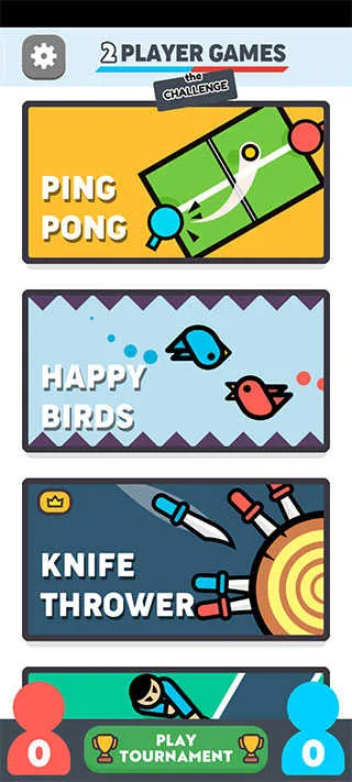 两个人的游戏挑战是轻量级休闲益智合集,原名2PlayerGames:TheChallenge。无需联网不占内存,一部手机就能双人对战。集成数十款小游戏,操作极简,支持单设备双人同屏,画风简洁,能提升反应力,持续更新,是聚会等场景的好选择。