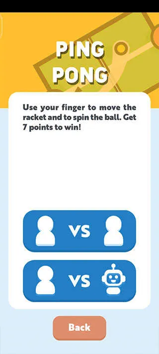 以乒乓球为例:进入后可自由选择「双人模式」(两人轮流触屏操作)或「人机模式」(单人对抗AI)。