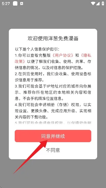 1、在本站下载安装洋葱漫画,然后打开进入到软件首页,如图所示,首先请用户们同意用户协议和隐私政策。